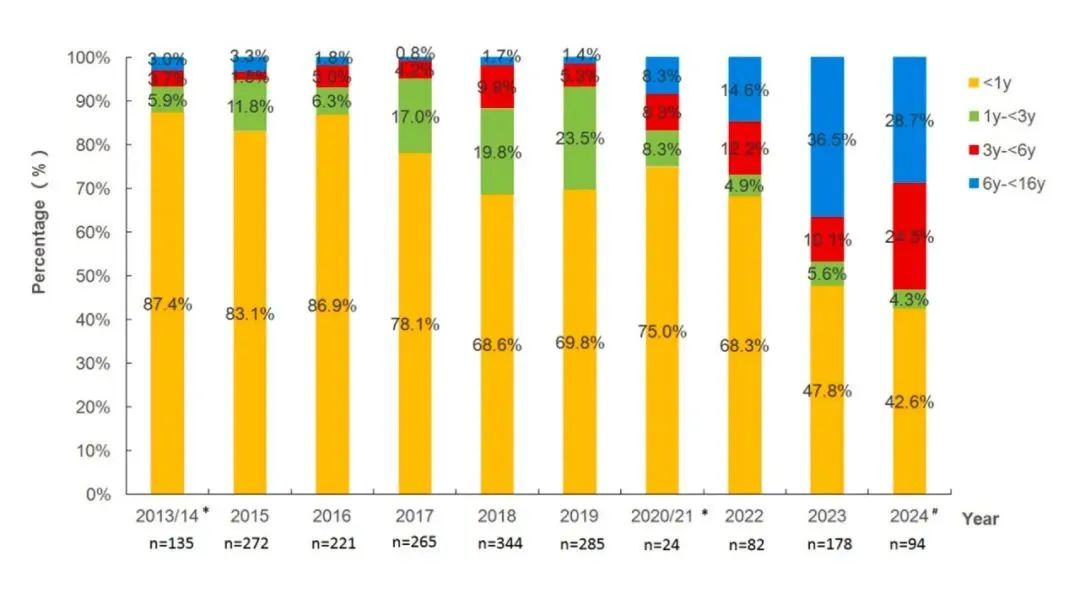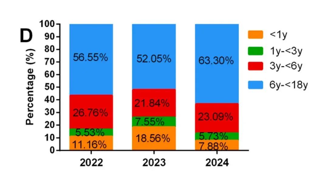 浙江大學(xué)醫(yī)學(xué)院附屬兒童醫(yī)院:從2022年至2024年,6-18歲患者人數(shù)大幅增加,占比最大(>52%)。