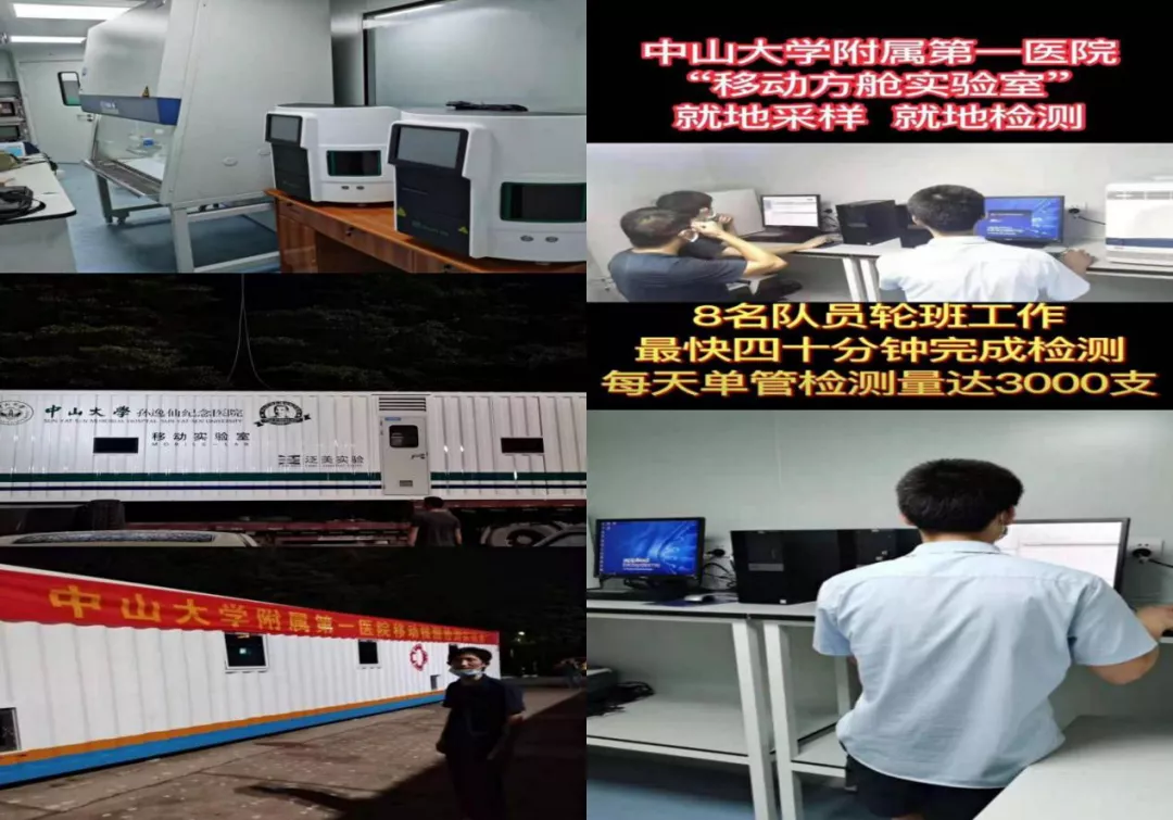 同一地點,他們還協(xié)助了中山大學(xué)孫逸仙紀念醫(yī)院“移動方艙實驗室”的儀器安裝調(diào)試。此“移動方艙實驗室”是一輛13.7米長的移動核酸檢測車,通過“就地采樣、就地檢測”的方式,日檢測量可達3000-5000人份(10比1混采可達3萬-5萬人份),真正做到了與病毒賽跑,與時間賽跑,為抗擊疫情作出了積極貢獻。