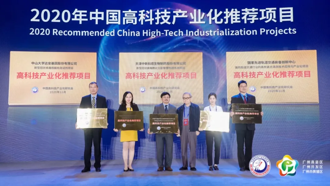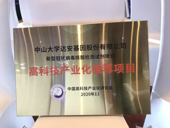 中山大學(xué)達(dá)安基因股份有限公司根據(jù)《高科技產(chǎn)業(yè)化推薦項(xiàng)目申報(bào)、評(píng)選辦法》的有關(guān)要求,及時(shí)提交了“新型冠狀病毒核酸檢測(cè)試劑項(xiàng)目”的項(xiàng)目申報(bào)書。由相關(guān)專業(yè)的院士、專家、企業(yè)家組成的評(píng)選委員會(huì)通過對(duì)申報(bào)材料進(jìn)行謹(jǐn)慎且專業(yè)的審查、評(píng)議,并由中高會(huì)理事長(zhǎng)會(huì)批準(zhǔn)并公示后,本項(xiàng)目最終獲得由中高會(huì)頒發(fā)的“高科技產(chǎn)業(yè)化推薦項(xiàng)目”稱號(hào)及牌匾。