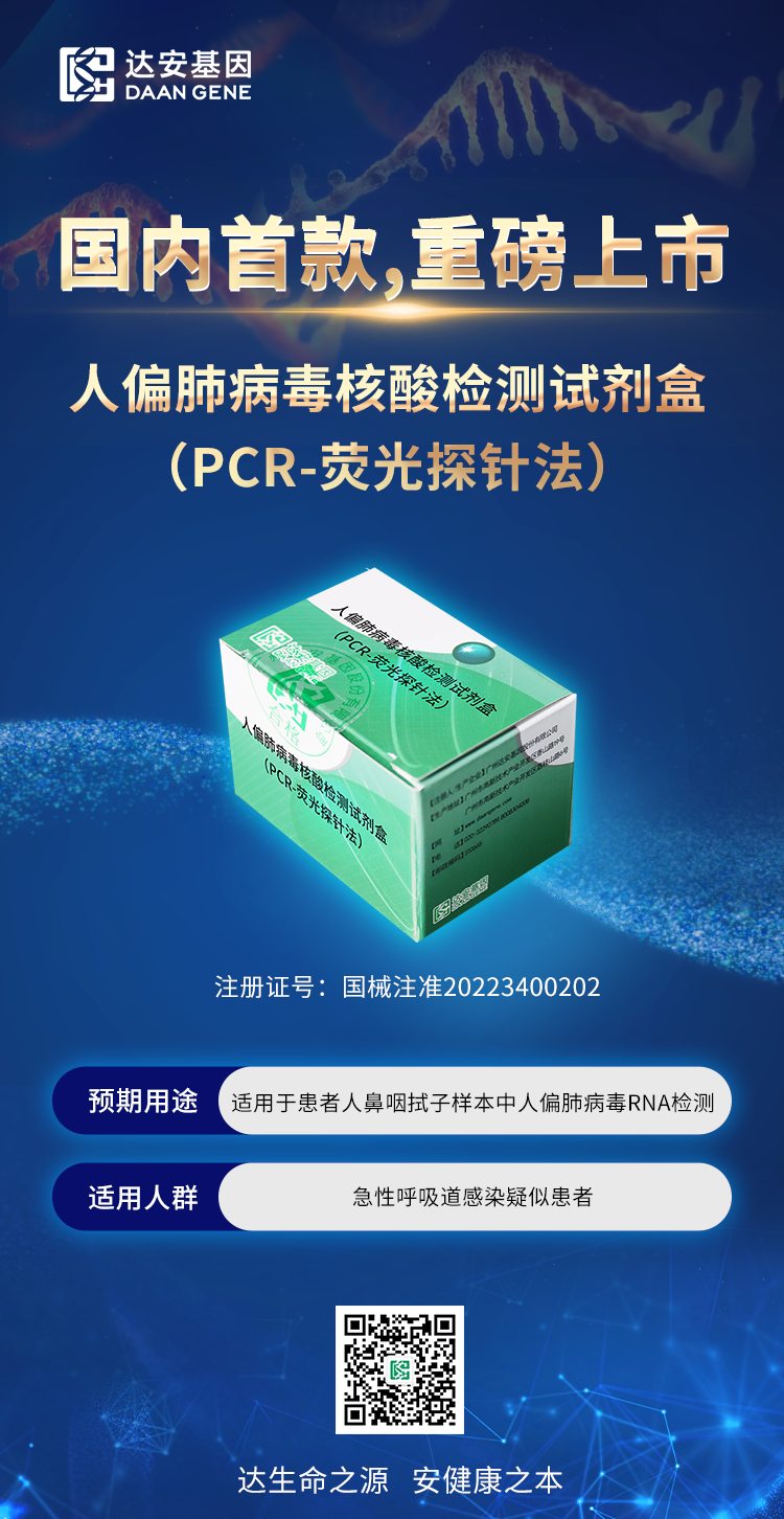 2022年2月15日,達(dá)安基因最新研制的人偏肺病毒核酸檢測試劑盒(PCR-熒光探針法)正式取得國家藥品監(jiān)督管理局(NMPA)三類醫(yī)療器械認(rèn)證,注冊證編號:國械注準(zhǔn)20223400202