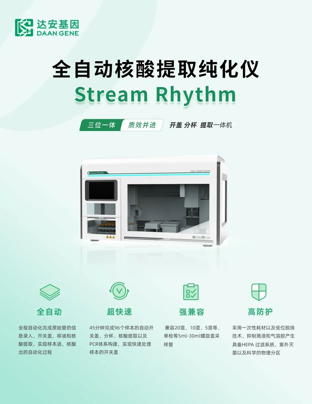 近日,達(dá)安基因推出Stream Rhythm全自動核酸純化儀(備案號:粵穗械備20220489),兼容原始管帶蓋上機(jī),自動化完成樣本信息錄入、樣本開關(guān)蓋、樣本轉(zhuǎn)移、核酸提取純化以及PCR體系構(gòu)建等核酸檢測前處理的全過程,簡化實驗室工作流程,大幅度提升實驗室工作效率,降低操作人員的工作強(qiáng)度,解放檢驗人員雙手。Stream Rhythm一機(jī)多用,實現(xiàn)分子實驗室自動化、集成化以及系統(tǒng)化樣本前處理功能。