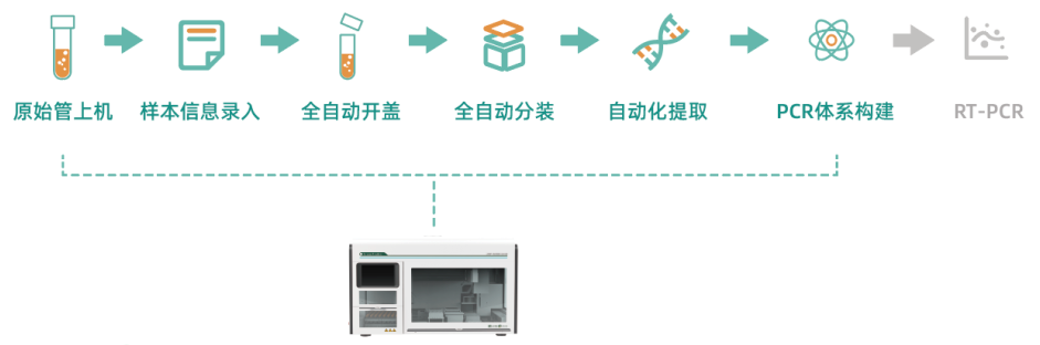 全程自動化完成原始管的信息錄入,開關(guān)蓋,移液和核酸提取,實現(xiàn)樣本進(jìn),核酸出的自動化過程。