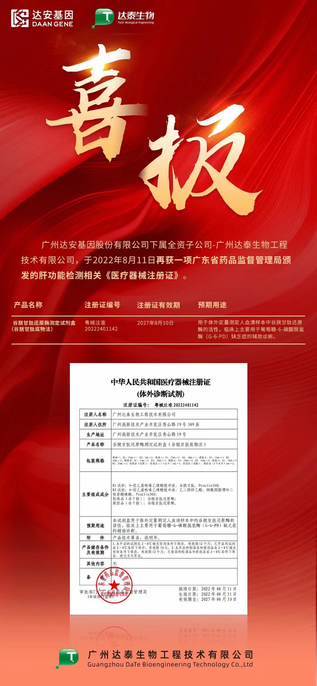 喜報(bào) 達(dá)安基因下屬全資子公司達(dá)泰生物一項(xiàng)產(chǎn)品獲批!