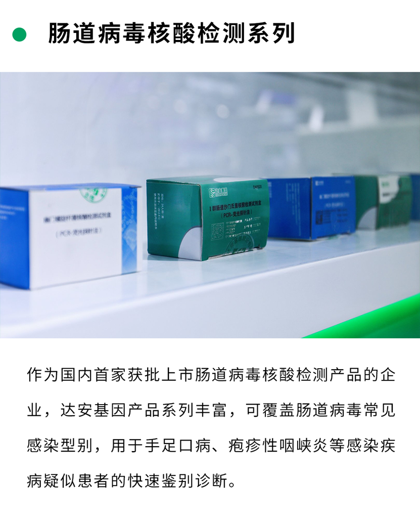 達(dá)安基因是以分子診斷技術(shù)為主導(dǎo),集臨床檢驗試劑、儀器和配套耗材的研發(fā)、生產(chǎn)、銷售為一體的國有生物醫(yī)藥高新技術(shù)企業(yè),業(yè)務(wù)范圍覆蓋分子診斷、免疫診斷、生化診斷、質(zhì)譜診斷、POCT等諸多領(lǐng)域,能夠為客戶提供多領(lǐng)域、完善的醫(yī)學(xué)診斷整體解決方案。經(jīng)過三十年的積累,已實現(xiàn)了研發(fā)生產(chǎn)、核心原料、質(zhì)控品、儀器研發(fā)生產(chǎn)、檢測服務(wù)核酸檢測技術(shù)全產(chǎn)業(yè)鏈貫通。