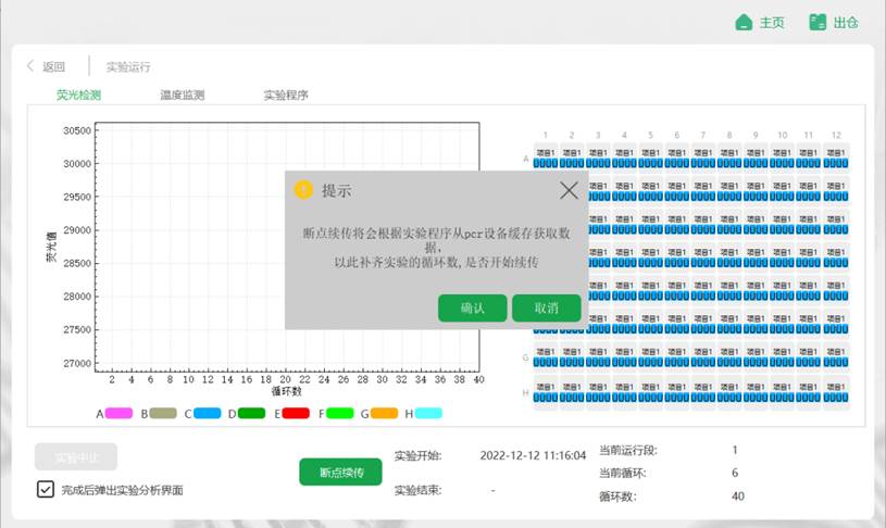運(yùn)行程序意外中止或退出后,若儀器仍在運(yùn)行中,可繼續(xù)收集實(shí)驗(yàn)過程中的溫度信息和熒光數(shù)據(jù);運(yùn)行完成后可重新下載實(shí)驗(yàn)的所有熒光數(shù)據(jù)以免因程序意外中止或退出后的結(jié)果丟失。