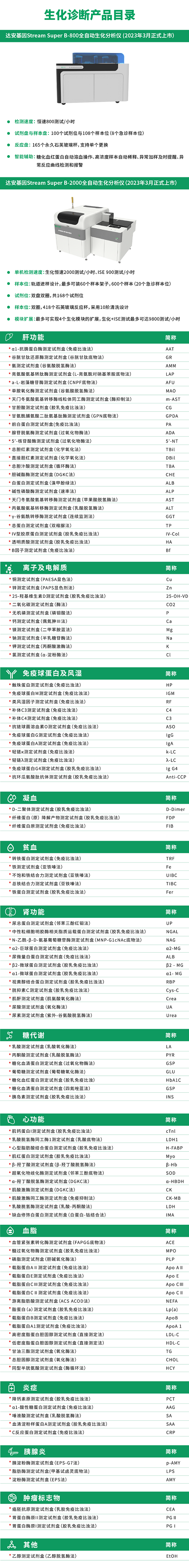 達(dá)泰生物目前已獲證的生化試劑涵蓋各類肝功能、離子及電解質(zhì)、免疫球蛋白及風(fēng)濕、凝血、貧血、腎功能等總計(jì)114項(xiàng),配套的全自動(dòng)生化分析儀也即將上市,以下是生化診斷產(chǎn)品目錄: