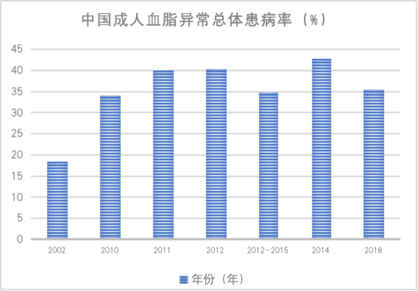 近幾十年來,中國人群的血脂水平、血脂異?;疾÷拭黠@增加,以高膽固醇血癥的增加最為明顯。2018年全國調(diào)查結(jié)果顯示,≥ 18歲成人血脂異常總患病率為 35.6%。